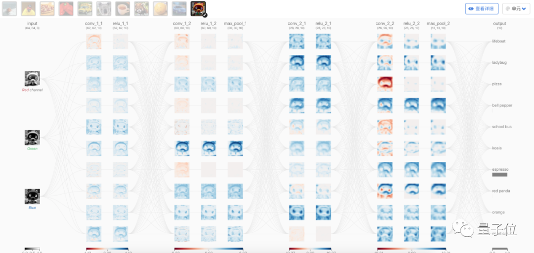 而且,这个网页工具还可以实现交互,只要点击其中任何一个格子——就是CNN中的“神经元”,就能显示它的输入是哪些、经过了怎样细微的变化。